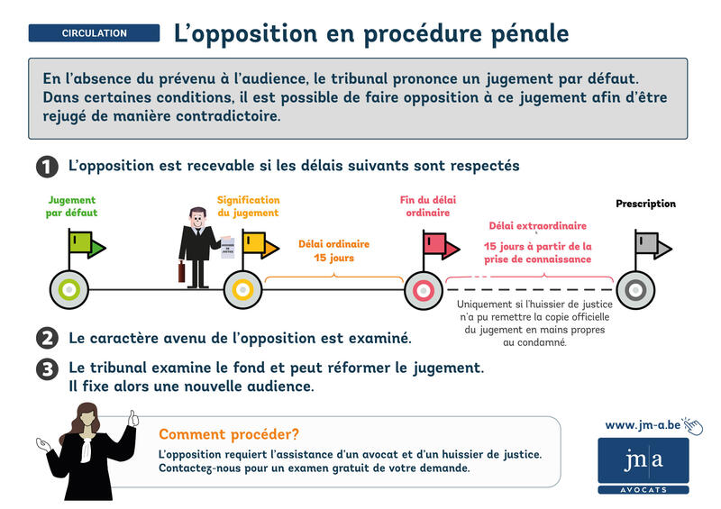 jugement par défaut, opposition procédure pénale Belgique, délai opposition, article 187 CIC, déchéance du droit de conduire, excuse légitime, force majeure, tribunal de police, contestation amende pénale, signification jugement, recours pénal, avocat.
